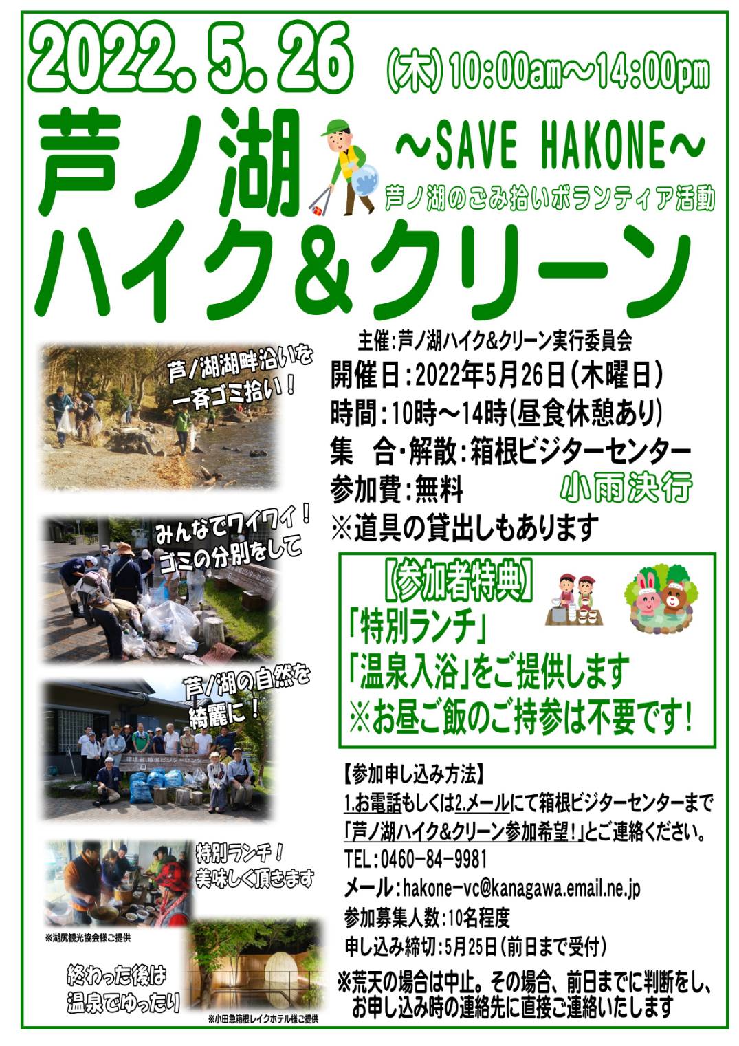 2022.04.15 22年5月ハイク&クリーン Tweet Share Hatena Pocket RSS feedly Pin it この記事のタイトルとURLをコピーする GWの楽しい期間が終わると、どうしても増えてしまううっかり落としてしまった「うっかりゴミ」たちを拾い集めるクリーンイベントを開催致します。 楽しくお話ししながら、芦ノ湖でのゴミ拾い、清掃活動を是非お手伝い下さい。 Tweet Share Hatena Pocket RSS feedly Pin it この記事のタイトルとURLをコピーする HAKONOWA□〇Vol.5 前の記事 GW特別イベント 次の記事