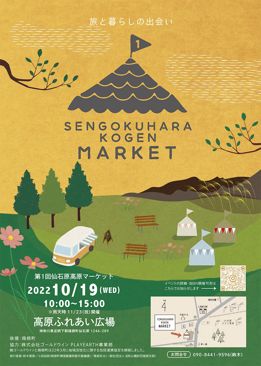 2022.09.13 10.19 仙石原高原マーケット Tweet Share Hatena Pocket RSS feedly Pin it この記事のタイトルとURLをコピーする 箱根に暮らし日々を楽しみながら活動している女性達が集まり企画しました。 旅の人と暮らす人、それぞれの出会いの場となればと願いを込めて、 平日の仙石原ススキ草原ふれあい広場で開催いたします。 Tweet Share Hatena Pocket RSS feedly Pin it この記事のタイトルとURLをコピーする 箱根DMO公認ガイド育成プロジェクト 前の記事 Leave No Trace トレーナー資格取得コース in 箱根 vol.2 次の記事