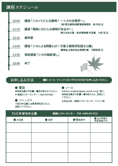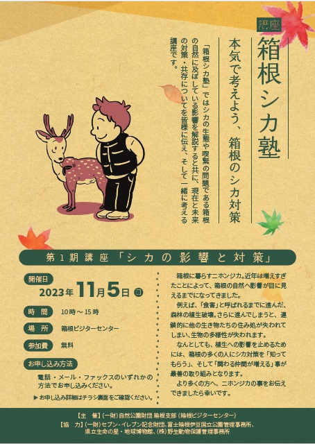 箱根の山の中を歩いていると、四季折々の豊かさを感じる一方で、ここ数年はシカによる食害を含めネガティブインパクトをよく目にするようになりました。登山道補修やゴミ拾い活動に加え、シカ対策は何かしたいと思ってはいるものの、素人の自分にとっては「何から始めればよいのかわからない、そもそもシカについて理解していない」のが現実。